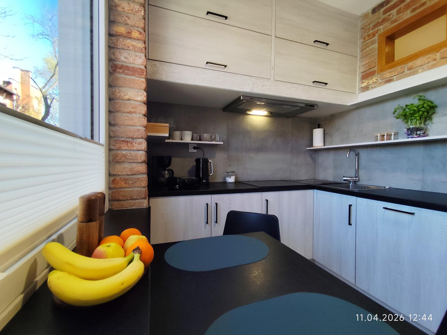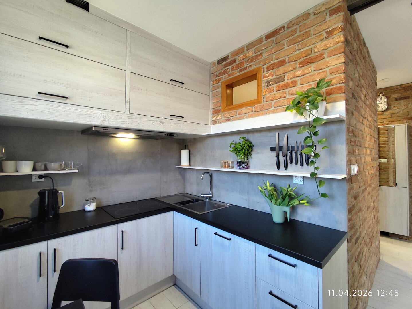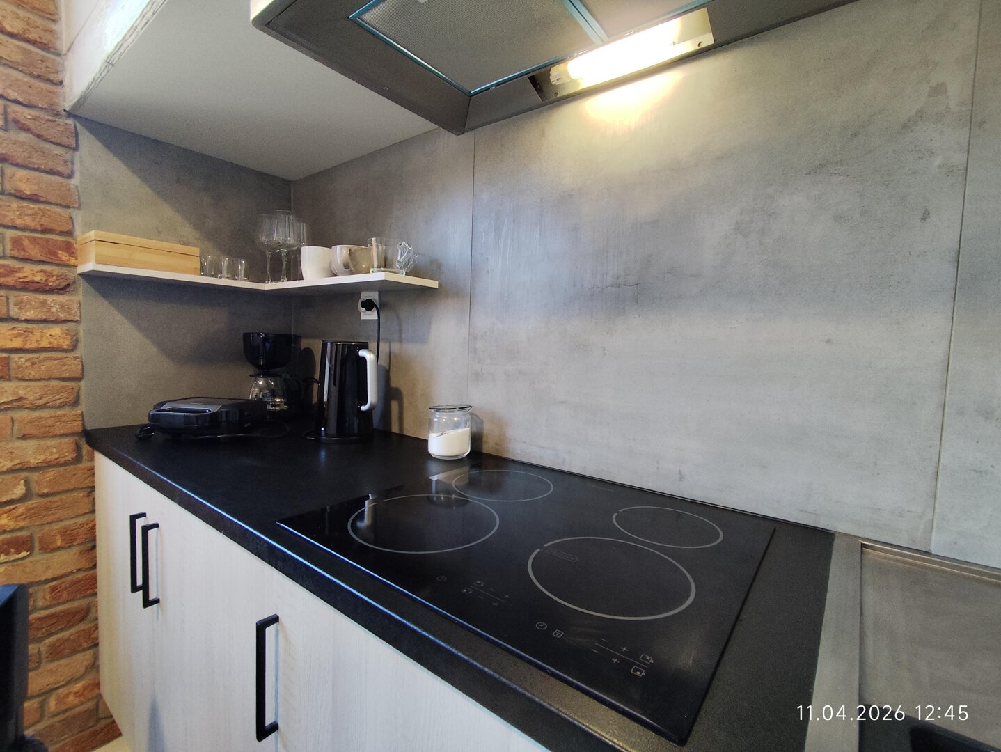 The kitchen is well-equipped, with a four-burner induction cooktop, an oven, a drip coffee maker, and an electric kettle. The kitchen is equipped with all the necessary appliances for preparing basic hot meals.