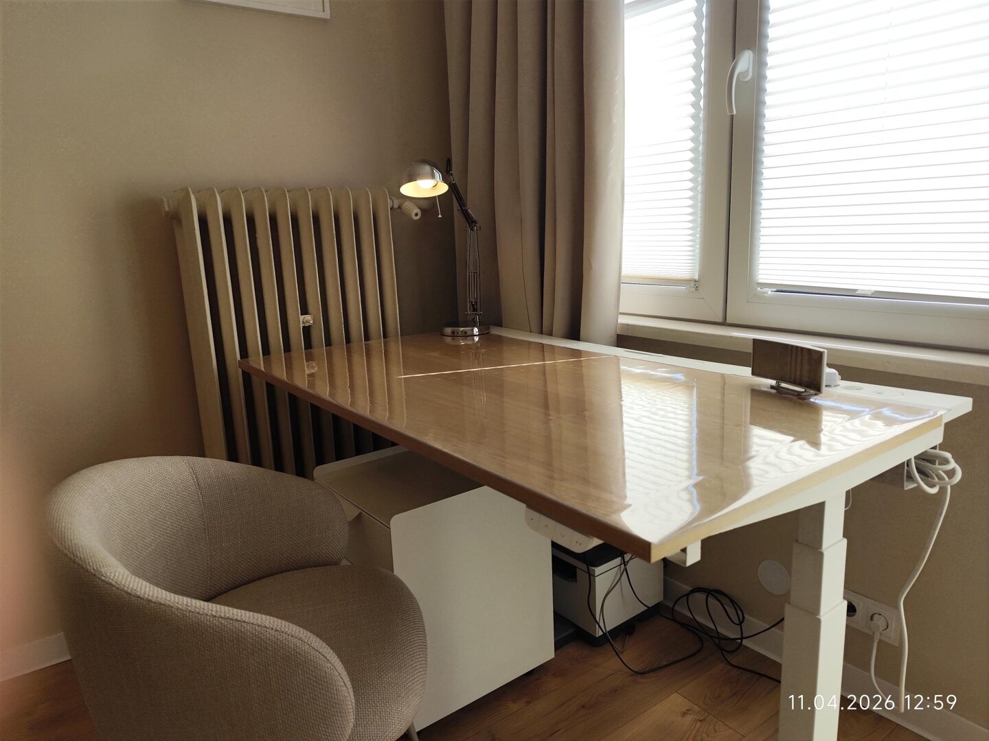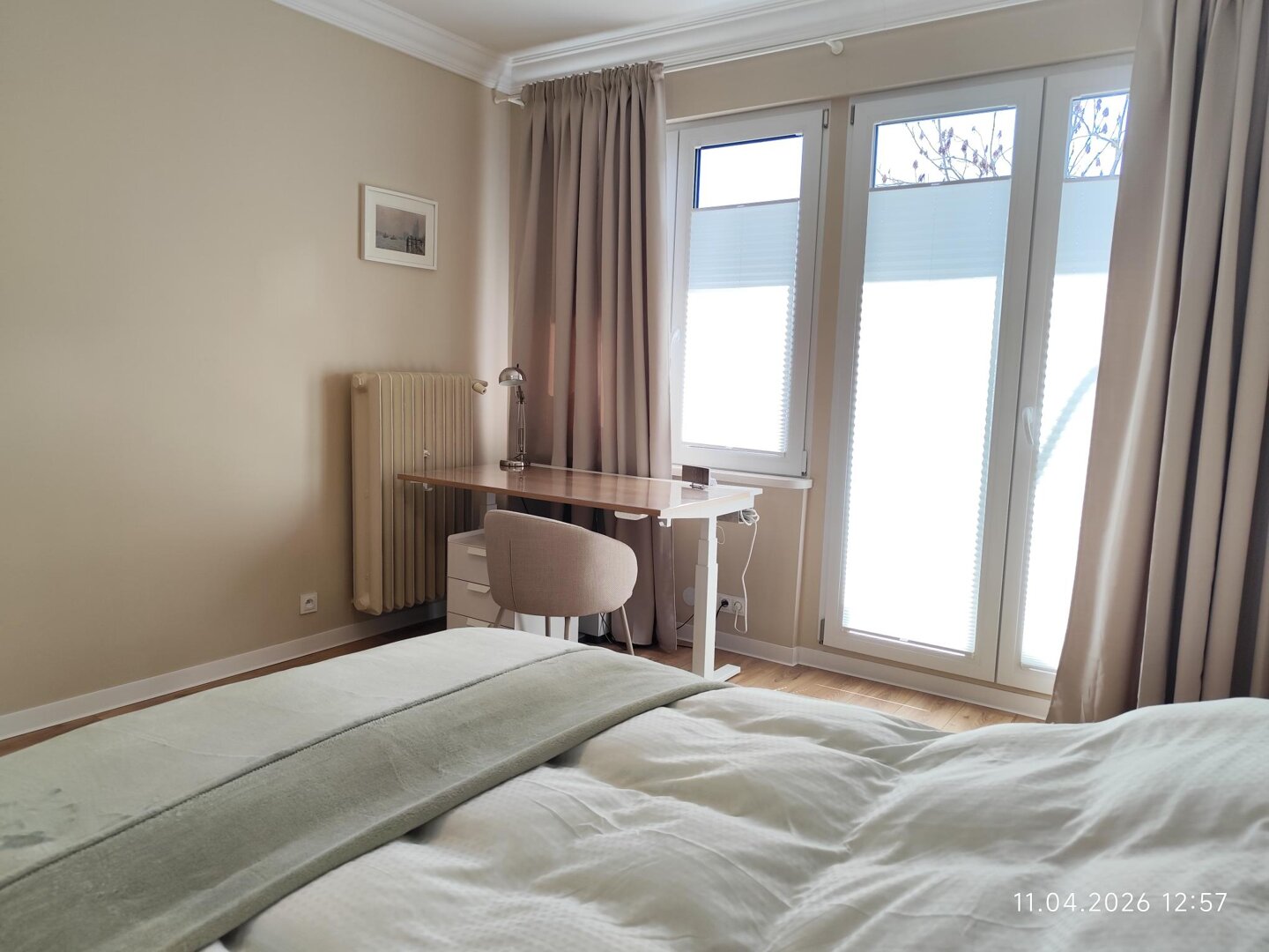 The bedroom features a workspace with a large desk with adjustable height and tilt.