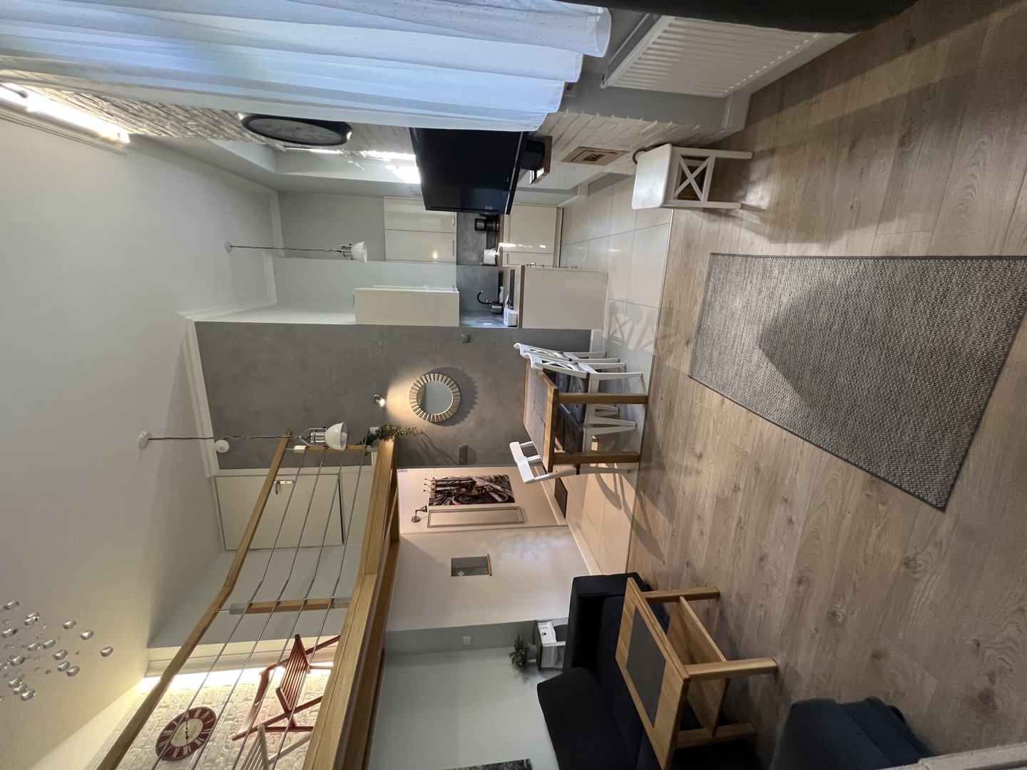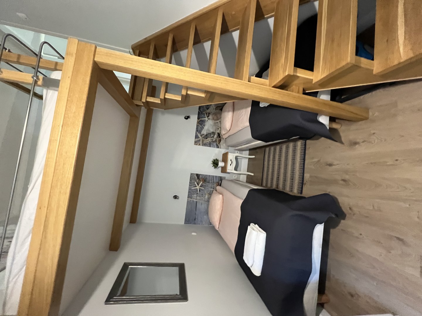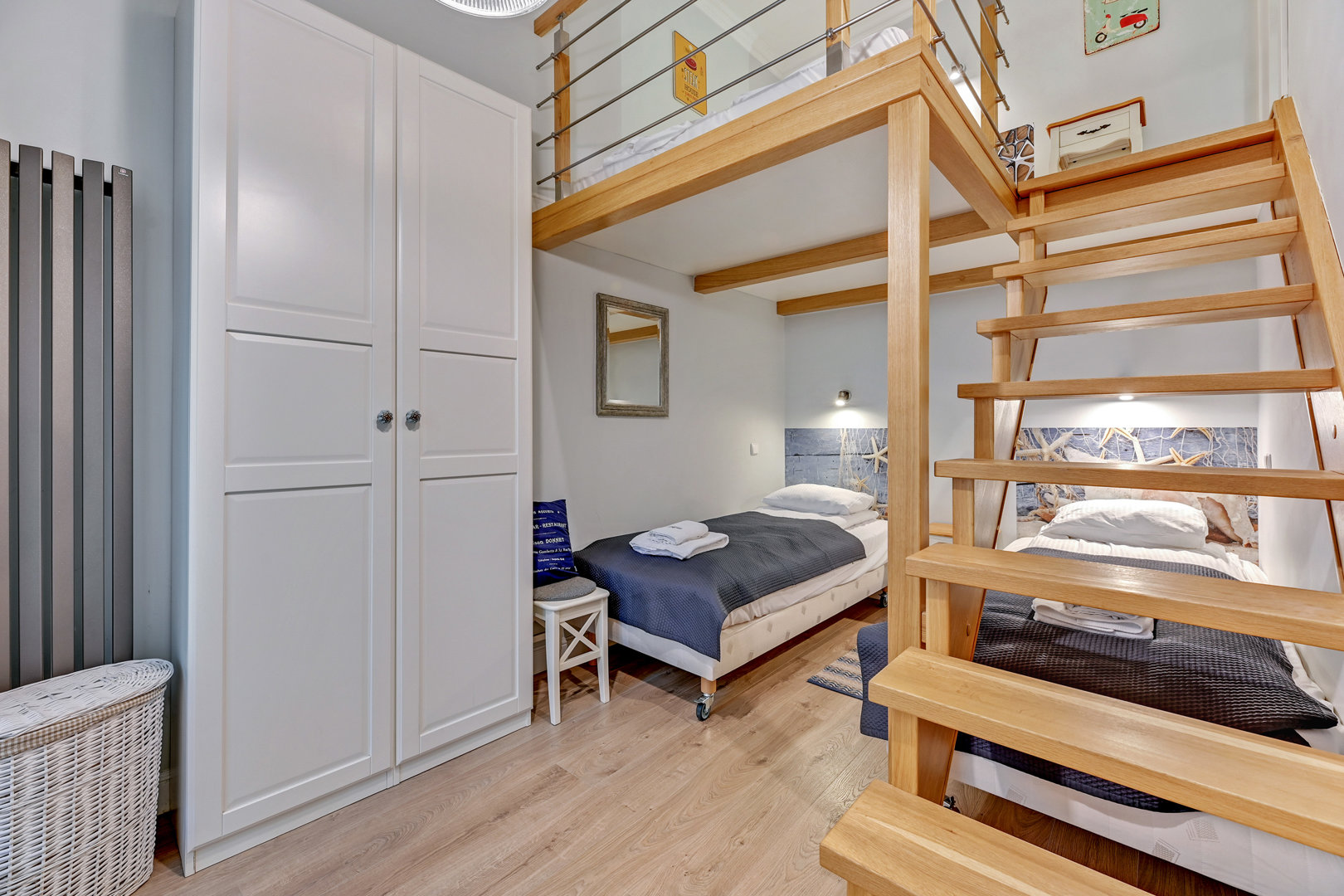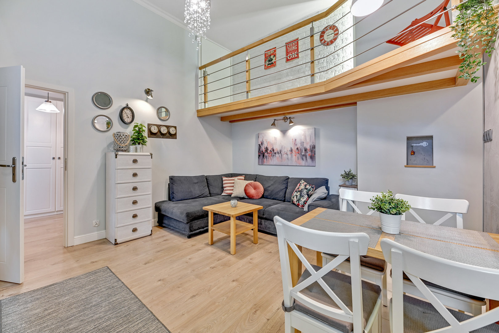 Nowoczesne mieszkanie typu studio z antresolą . Bardzo ciekawa aranżacja mieszkania wykorzystująca wysokośc pokoi na stworzenie dodatkowej przestrzeni do spania dla dodatkowych dwóch osób. Na pierwszym poziomie znajduje się salon z aneksem kuchennym. W salonie znajduje się duża sofa narożna o szerokości 140 cm po rozłożeniu. Sypiania oddzielona drzwiami z dwoma łóżkami po 80 cm szerokości typu twinbed. W sypialni znajduje się wejście na antresolę . Antresola ma obiżoną wysokość do 180 cm. Doskonałe miejsce do spania dla dzieci.