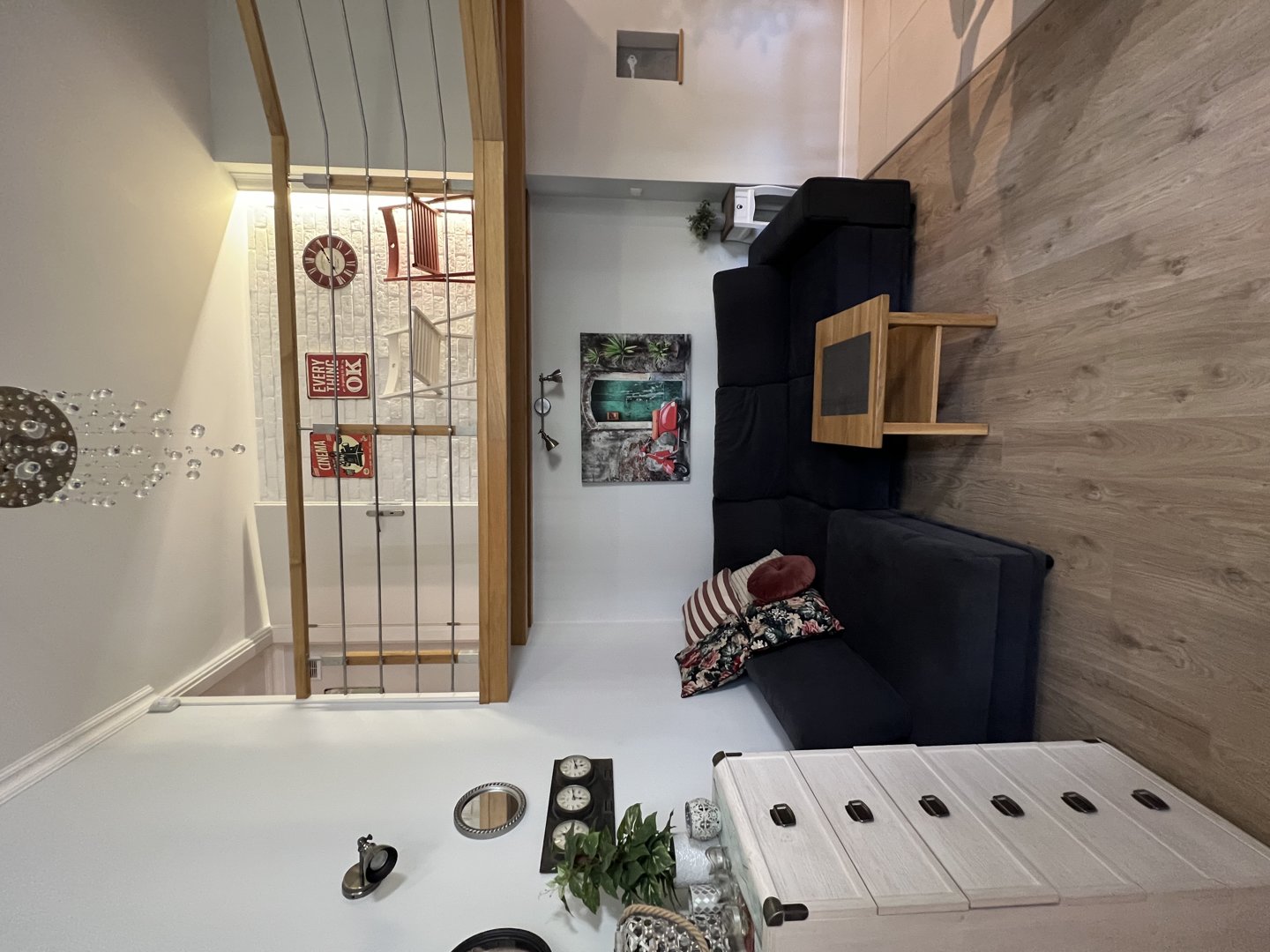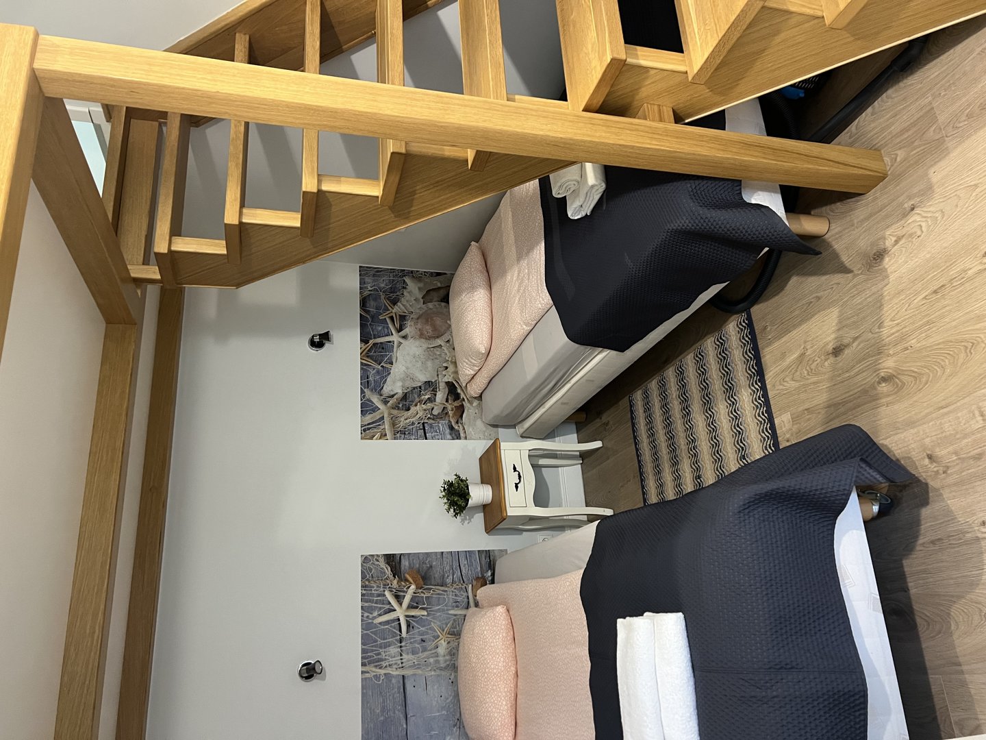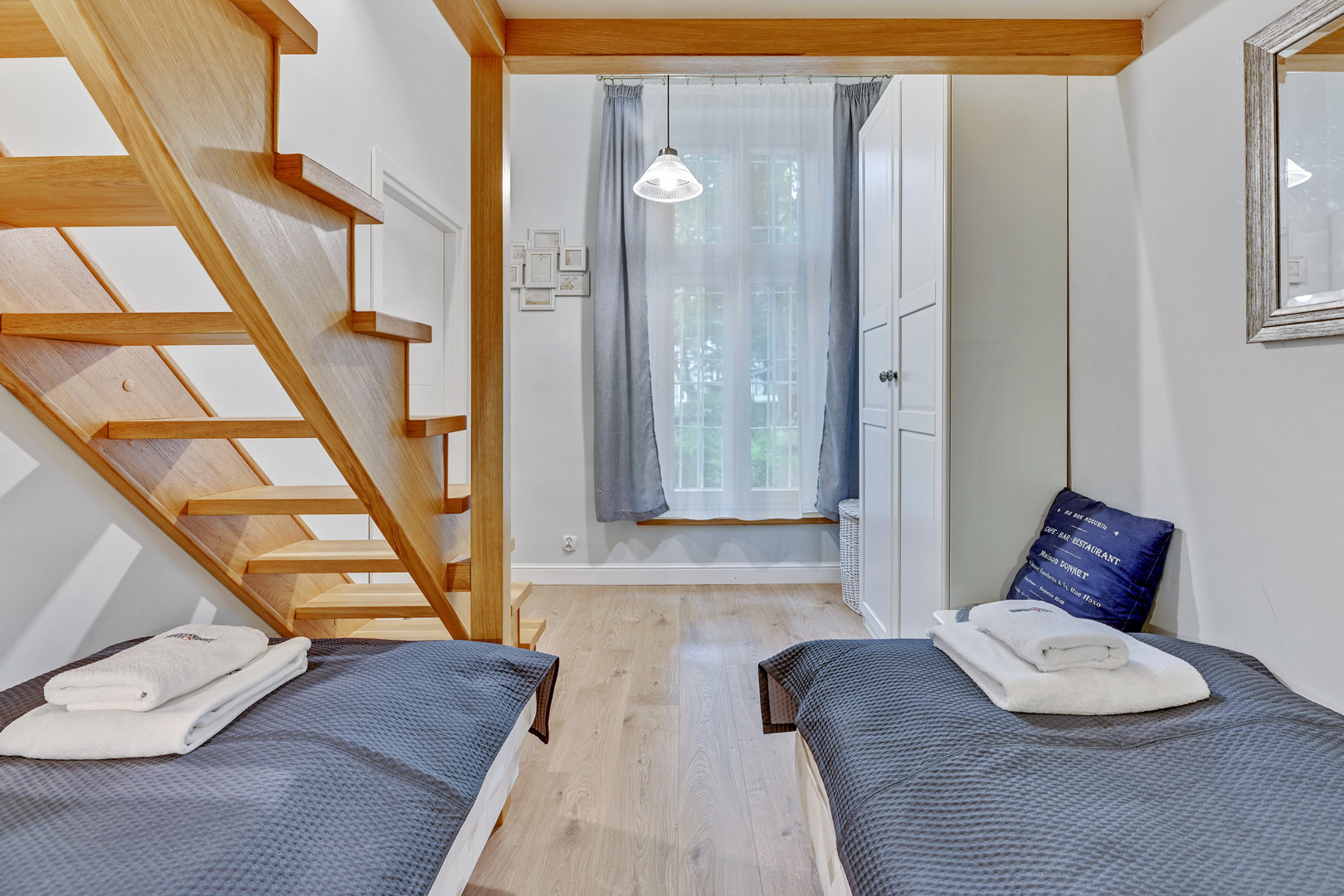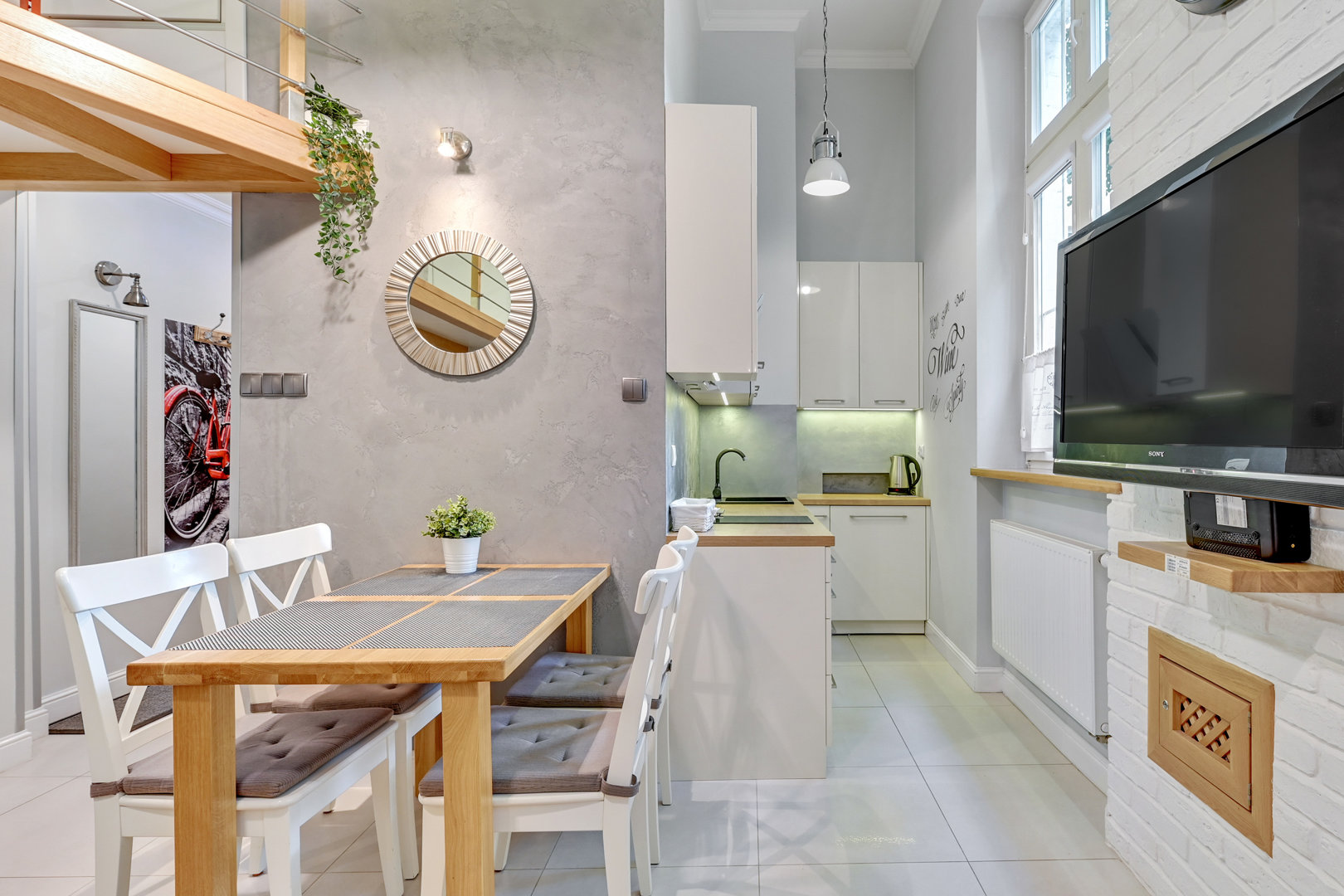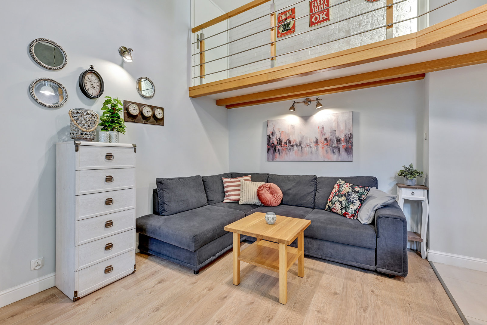 Nowoczesne mieszkanie typu studio z antresolą . Bardzo ciekawa aranżacja mieszkania wykorzystująca wysokośc pokoi na stworzenie dodatkowej przestrzeni do spania dla dodatkowych dwóch osób. Na pierwszym poziomie znajduje się salon z aneksem kuchennym. W salonie znajduje się duża sofa narożna o szerokości 140 cm po rozłożeniu. Sypiania oddzielona drzwiami z dwoma łóżkami po 80 cm szerokości typu twinbed. W sypialni znajduje się wejście na antresolę . Antresola ma obiżoną wysokość do 180 cm. Doskonałe miejsce do spania dla dzieci.
