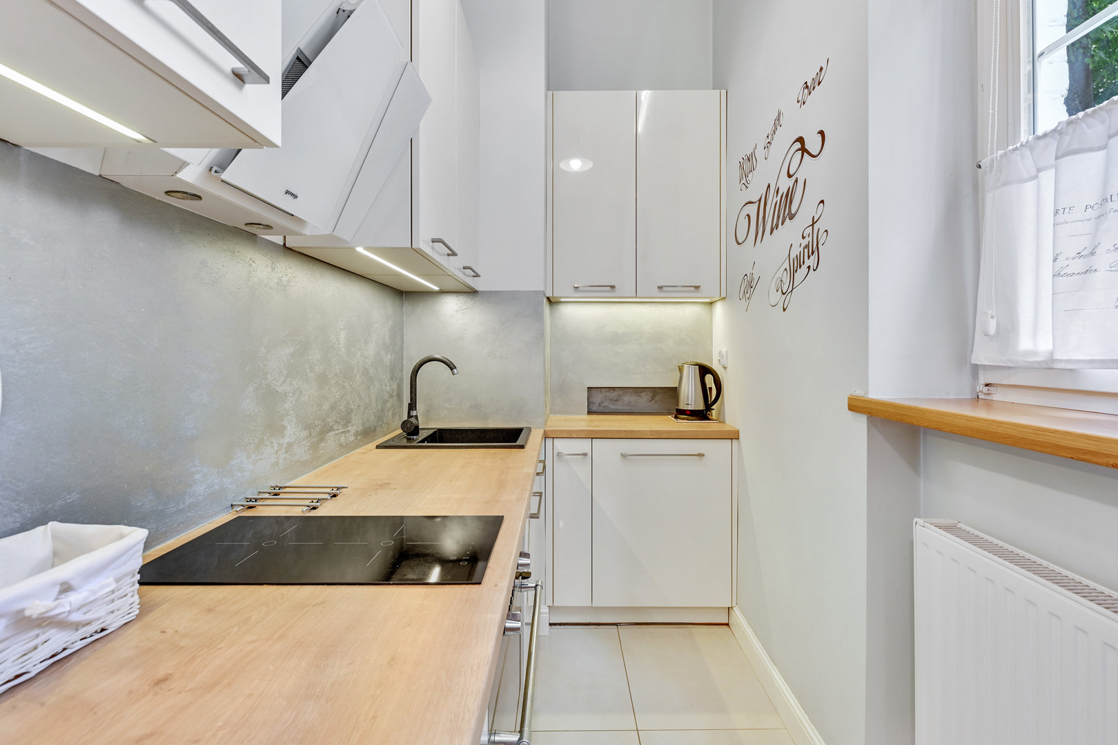 Łazienka z prysznicem . Do dyspozycji gości pralka i zmywarka do naczyń. Okna mieszkania wychodzą na podwórko. w związku z tym do mieszkania nie dociera zgiełk centrum miasta.